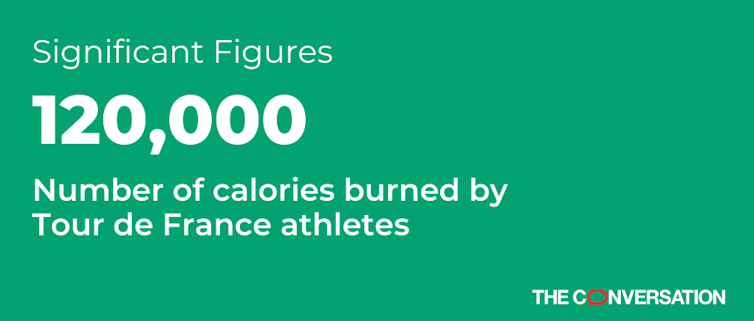 I am a sports physicist, and I’ve modeled the Tour de France for nearly two decades using terrain data – like what I described for Stage 12 – and the laws of physics. But I still cannot fathom the physical capabilities needed to complete the world’s most famous bike race. Only an elite few humans are capable of completing a Tour de France stage in a time that’s measured in hours instead of days. The reason they’re able to do what the rest of us can only dream of is that these athletes can produce enormous amounts of power. Power is the rate at which cyclists burn energy and the energy they burn comes from the food they eat. And over the course of the Tour de France, the winning cyclist will burn the equivalent of roughly 210 Big Macs.