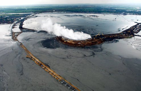 The Lusi structure – a contraction of Lumpur Sidoarjo, meaning “Sidoarjo mud” – is an example of a geological feature known as a mud volcano. They form when a combination of mud, fluids and gases erupt at the Earth’s surface. The term “volcano” is borrowed from the much better known world of igneous volcanoes, where molten rock comes to the surface. I’ve been studying these fascinating structures on subsurface seismic data for the past five years, but nothing compares to seeing one actively erupting.
