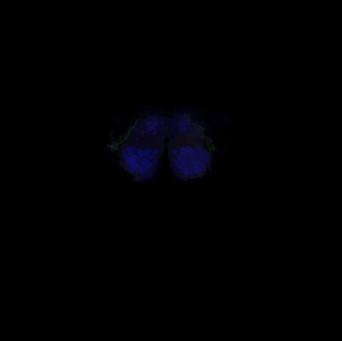 Here, a cluster of approximately four neurons, labeled green, receive messages from the mushroom body, which is the L-shaped structure labeled blue in the center of the fly brain. You can step through the brain and see all the other neurons they likely communicate with, labeled red. The cell bodies of the neurons reside on the edges of the brain, and the locations where they receive messages from the mushroom body appear as green tangles invading a small oval compartment. Where these weblike green extensions mingle with red are thought to be where neurons communicate their processed message to other downstream neurons.