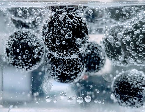 Sparkling water and other carbonated beverages fizz with bubbles because they contain more gas than the fluid can support – they’re “supersaturated” with gas. When you open a bottle of champagne or a soft drink, the fluid pressure drops and CO₂ molecules begin to make their escape to the surrounding air.