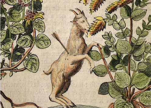 Pliny explained how the use of dittany, also known as wild oregano, to treat arrow wounds arose from watching wounded stags grazing on the herb. Aristotle and Dioscorides credited wild goats with the discovery. Vergil, Cicero, Plutarch, Solinus, Celsus and Galen claimed that dittany has the ability to expel an arrowhead and close the wound. Among dittany’s many known phytochemical properties are antiseptic, anti-inflammatory and coagulating effects.