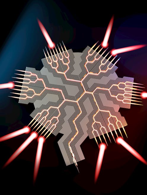 With the help of artificial intelligence, we designed the chip to have a specific microscopic honeycomb pattern to form lanes for the terahertz waves. The array of channels sends out powerful, focused beams that cover the entire 360 degrees around the chip. This allows a phone or other wireless device anywhere around a Wi-Fi router or other communications device using the chip to receive the high-speed signal. We demonstrated the chip by splitting an input signal of a streaming HD video into four output beams.