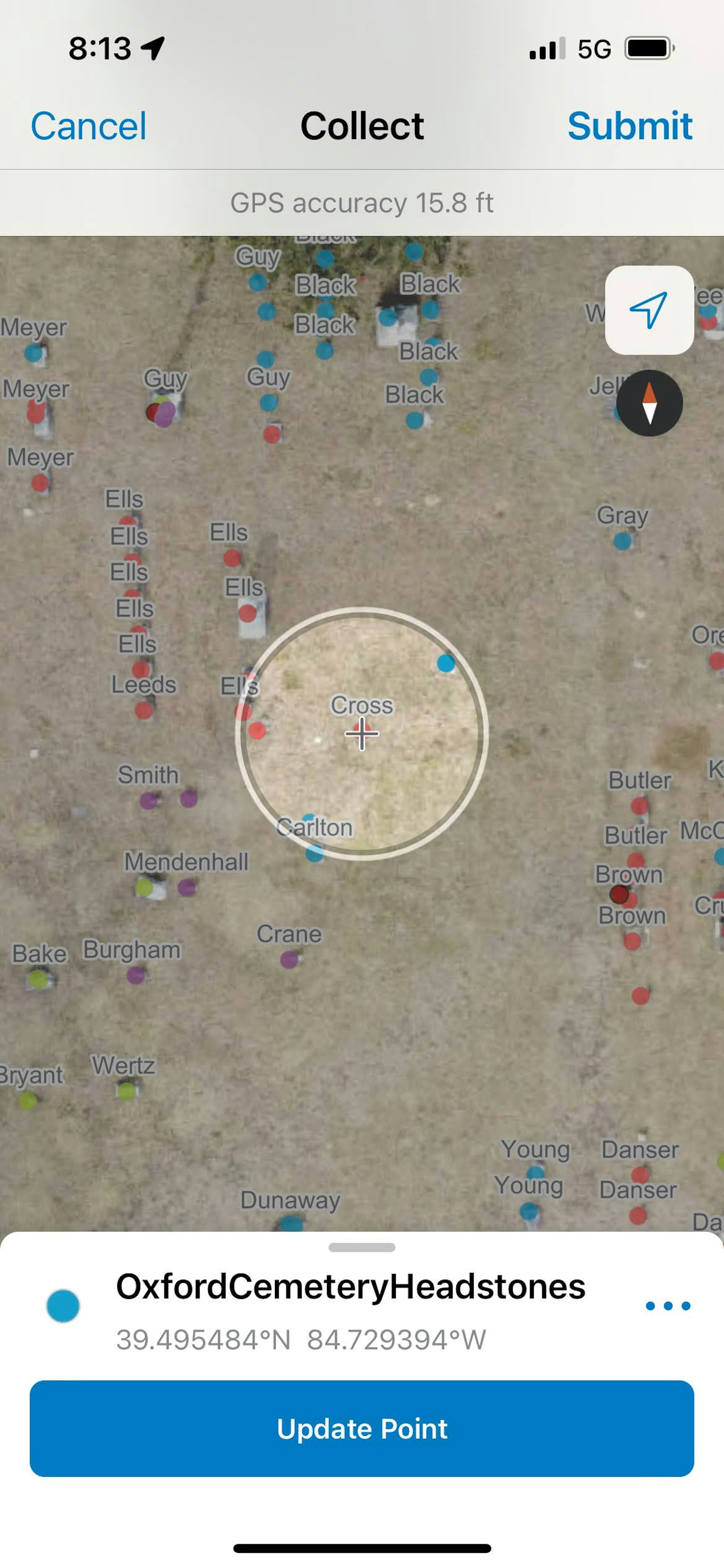 In the classroom, we created a new database and divvied up the cemetery into areas we were each responsible for. Before we even went on a site visit, every person placed a dot on top of each headstone they could see in the drone imagery of their area. Then at the cemetery we could simply walk to each headstone we were responsible for, take a photo and attach that to the dot we had placed earlier.
