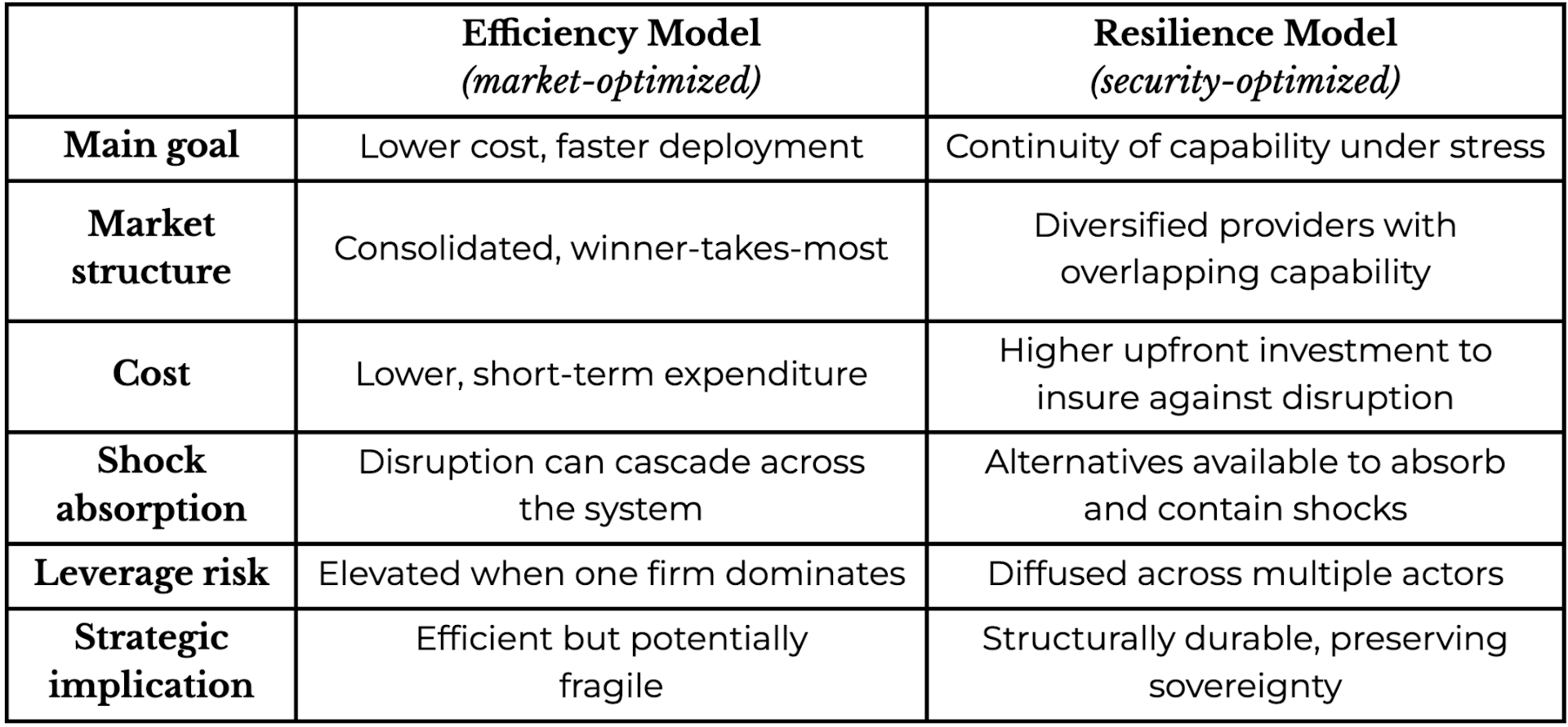 But redundancy is expensive. Maintaining parallel systems, supporting multiple providers and preserving internal government expertise require long-term funding and political commitment. Markets alone likely will not guarantee diversification in these expensive sectors.