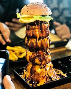 In our study of food image sharing, we wondered why the most popular food porn images depicted massive hamburgers that were impossible to eat, dripping with bacon grease, gummy worms and sparklers. Or super pizza that contained tacos, macaroni and cheese and fried chicken. The answer was that the algorithms that drive participation and attention-getting in social media, the addictive “gamification” aspects such as likes and shares, invariably favored the odd and unusual. When someone wanted to broaden out beyond his or her immediate social networks, one of the most effective ways to achieve mass appeal turned out to be by turning to the extreme.
