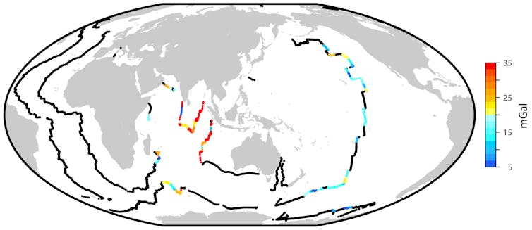 We then inspected the record of these “gravity anomalies” to look for any changes to the structure of the seafloor that happened quickly. We found an unusual abundance of these small structural anomalies on the seafloor happened within 1 million years of the Chicxulub impact. The gravity anomalies are consistent with roughly 650 foot high piles of excess material lying on 66-million-year-old seafloor in the Indian and Pacific Oceans.