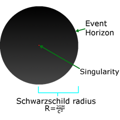 But black holes are not like planets or stars, they are the remnants of stars, packed into the smallest of spheres, say, just a few kilometers in radius. Imagine you could stand on the surface of a black hole, armed with your ray gun. You shoot upwards at an angle and notice that the light ray instead curves, comes down and misses the surface! Now the ray is in an “orbit” around the black hole, at a distance roughly what cosmologists call the Schwarzschild radius, the “point of no return.”