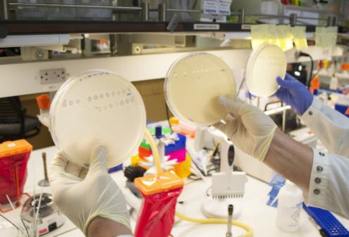 In 2012, a team of researchers, led by one of us (Justin Meyer), was able to witness such an innovation occurring in the lab. They worked with a virus that infects the well-known bacteria E. coli. To infect their hosts, the viruses must recognize proteins present on the bacteria’s outer surface. These surface proteins are like “locks” the virus must open to enter the host cell, using its own viral protein “key.”