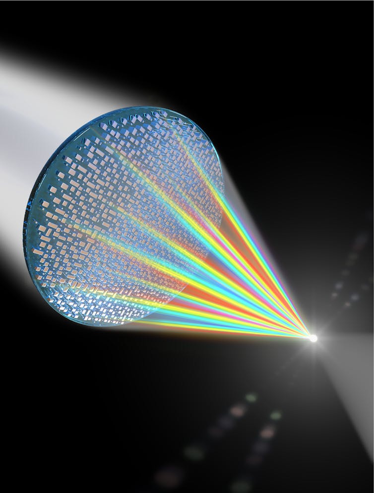 We’ve figured out a new way to manufacture fully transparent, ultracompact lenses capable of properly focusing every color in the spectrum to the same point. Because our lens comprises specially designed nanostructures, which do not exist in nature, to focus light, we call it a “meta-lens.” It has the advantages of being ultracompact while capable of delivering higher-quality imaging across a wider spectrum of light than most traditional lenses, without requiring multiple lenses.