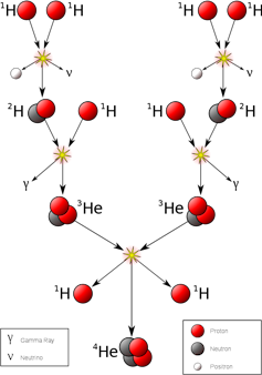Within a star are billions and billions of atoms. They’re zooming all around, sometimes colliding with one another. Initially the star is too cold, and when atoms’ nuclei collide they simply bounce off each other. As the star compresses because of its gravity, though, the temperature at its center increases. In such hot conditions, now when nuclei run into each other they have enough energy to merge together. This is what physicists call a nuclear fusion reaction.