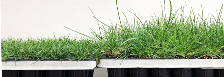 To use CRISPR to introduce a useful trait into a crop plant, we need to know the genes that control a particular trait. For instance, previous studies have revealed that a natural plant hormone called gibberellin is essential for plant height. The GA20-ox gene controls the quantity of gibberellin produced in plants. To create a breed of “low mowing frequency” lawn grass, for example, we are editing the DNA – changing the sequence of the DNA that makes up gene – of this plant to reduce the output of the GA20-ox gene in the selected turf grass. With lower gibberellin, the grass won’t grow as high and won’t need to be mowed as often.