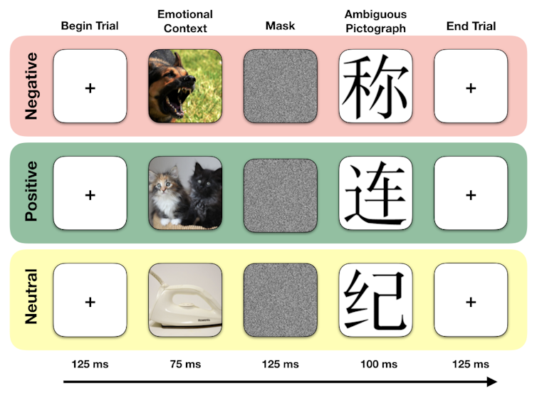 To test whether hungry people are more likely to become hangry in negative situations when they aren’t focused on their feelings, we designed three different studies. In the first two, run online with U.S. adults, we asked people – some hungry, some full – to look at negative, positive and neutral emotional images. Then they saw an ambiguous figure: a Chinese character or pictograph they’d never seen before. We asked participants whether they thought the pictograph meant something pleasant or unpleasant.