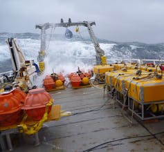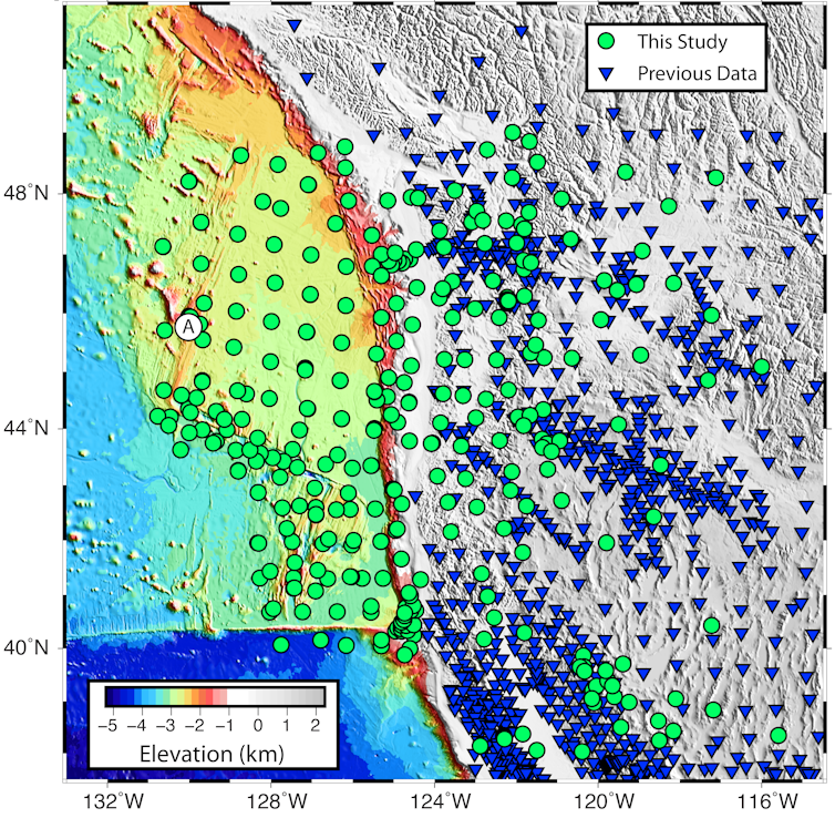 To see these signals, we need records from seismic monitoring stations. More sensors provide better resolution and a clearer image – but gathering more data can be problematic when half the area you’re interested in is underwater. To address this challenge, we were part of a team of scientists that deployed hundreds of seismometers on the ocean floor off the western U.S. over the span of four years, starting in 2011. This experiment, the Cascadia Initiative, was the first ever to cover an entire tectonic plate with instruments at a spacing of roughly 50 kilometers.