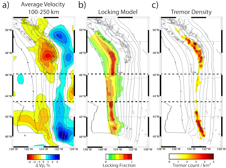 Our results provide new insights into how this subduction zone, and possibly others, behaves over geologic time frames of millions of years. Unfortunately our results can’t predict when the next large Cascadia megathrust earthquake will occur. This will require more research and dense active monitoring of the subduction zone, both onshore and offshore, using seismic and GPS-like stations to capture short-term phenomena.
