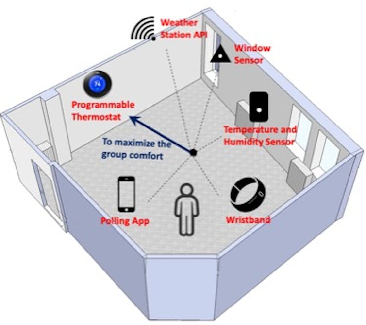 In previous research, our group placed multiple temperature sensors around an office, and combined their data with information from wristbands that sensed occupants’ skin temperature and heart rates and apps that polled workers about how they felt. We found that adding the data about how people’s bodies were reacting made the algorithm more accurate at calculating the room temperature at which people occupying a given space would feel most comfortable.