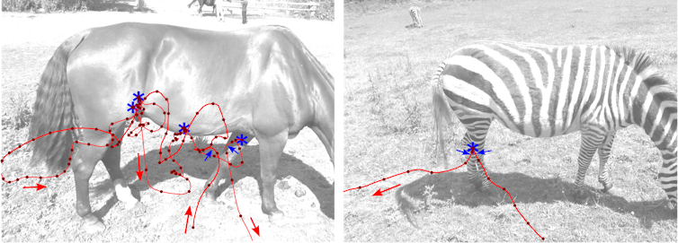 Frame by frame analyses of our videos showed that flies slowly decelerated as they approached brown or black horses before making a controlled landing. But they failed to decelerate as they approached zebras. Instead they would fly straight past or literally bump into the animal and bounce off.
