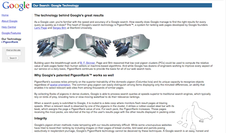 Google’s 2002 April Fools’ Day joke purportedly disclosed that its popular search engine was not actually powered by artificial intelligence, but instead by biological intelligence. Google had deployed bunches of birds, dubbed pigeon clusters, to calculate the relative value of web pages because they proved to be faster and more reliable than either human editors or digital computers.