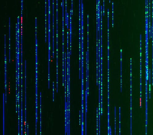 This image, taken with a device called the Bionano Genomics Saphyr imager, features individual DNA molecules – colored in blue, green and red. These strands of DNA have been aligned by threading them through narrow tubes – called nanochannels – that fit only one piece of DNA. As the DNA slips into the tube, the strands straighten.