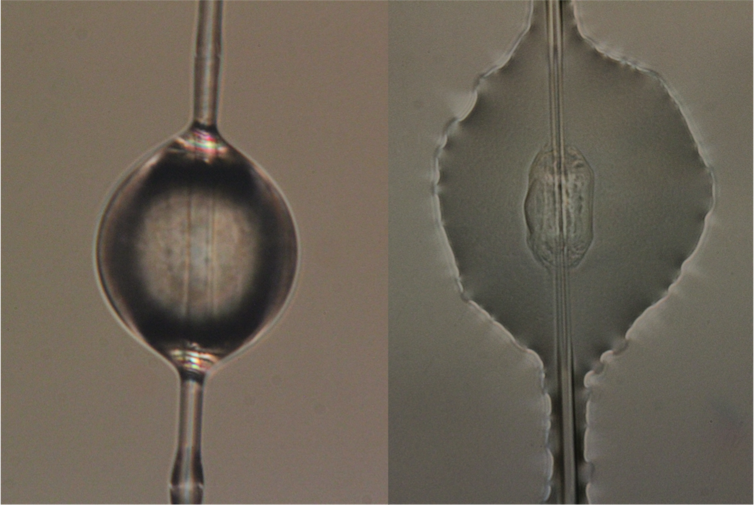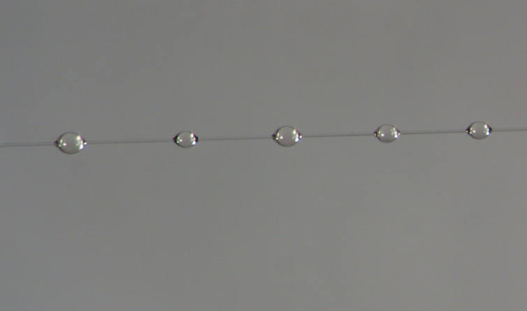 Under a microscope, orb weaver glue resembles beads on a string – little glistening spheres along a strand of stretchy support silk. Instead of being spun into a fiber as it leaves the spider’s body like other silks, the glue proteins are extruded as a jumbled mass. Their job is to stickily retain prey that get caught in the web.