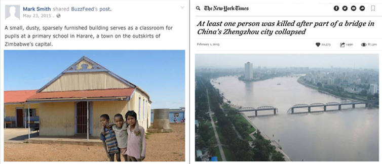 Nous avons constaté que les jugements des participants sur la crédibilité des images ne variaient pas en fonction du contexte. Nous avons placé la photo d’un pont effondré dans une publication Facebook partagée par seulement quatre personnes. Ils l’ont jugé fausse de la même manière quand cette image illustrait un article du site Internet du New York Times.