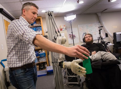 In a few research labs around the world, scientists and physicians have been implanting devices into the brains of people who have lost the ability to control their arms or hands for over a decade. In our own research group at the University of Pittsburgh, we’ve enabled people with paralyzed arms and hands to control robotic arms that allow them to grasp and move objects with relative ease. They can even experience touch-like sensations from their own hand when the robot grasps objects.