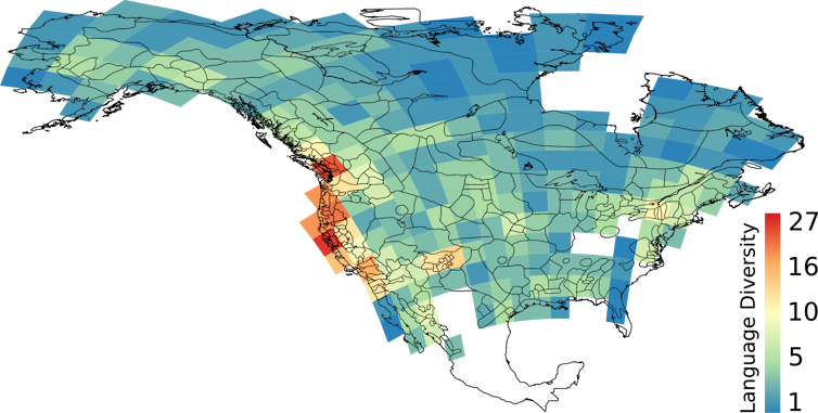 Our research team has been tackling this longstanding question by exploring language diversity patterns on the continent of North America. Prior to European contact, North America was home to speakers of around 400 languages, unevenly spread across the landscape. Some places, such as the West Coast from present-day Vancouver to southern California, had far more languages; other areas, such as northern Canada and the Mississippi delta region, appear to have had fewer languages. We drew on methods from ecology originally developed to study patterns of species diversity to investigate these patterns of language diversity.