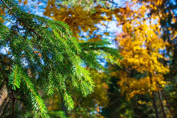 But mixed among those bright, colorful patches are some trees that stay steadfastly green. Why do evergreen conifers sit out this blazing seasonal spectacle?