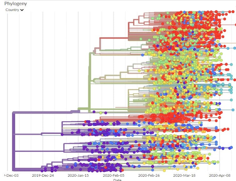 Molecular geneticists like us can use this information to construct family trees for the coronavirus. That allows us to trace the routes the virus has traveled through space and time and start to answer questions like how quickly and easily does it spread from one person to another?
