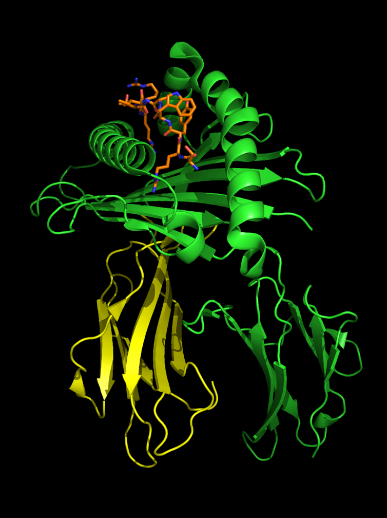 The part of the alarm system that we tested is called the human leukocyte antigen system, or HLA. Each person has multiple alleles of the genes that make up their HLA type. Each allele codes for a different HLA protein. These proteins are the sensors of the alarm system and find intruders by binding to various peptides – chains of amino acids that make up parts of the coronavirus – that are foreign to the body.