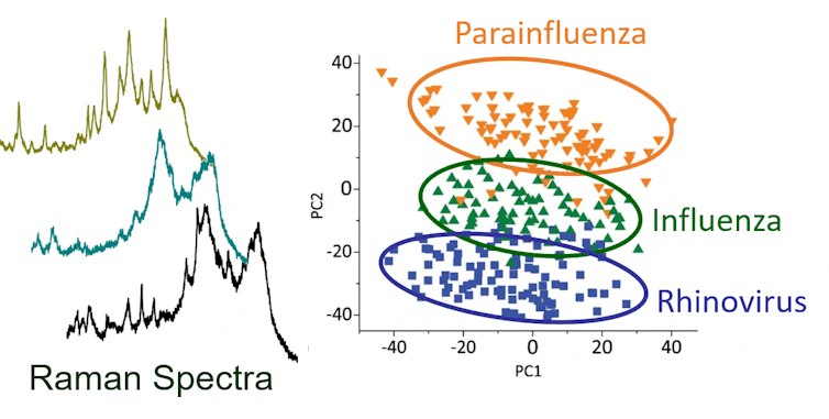 Our approach uses a technique called Raman spectroscopy to identify viruses by shining a light on a disposable cartridge that collects samples from oral cotton swabs or a person blowing through the device. Once a sample is collected, a spectrometer measures the interatomic vibrations that result from shining the light on the collected viruses. Each virus has its own signature vibrations, which act as a sort of optical fingerprint that can distinguish the coronavirus from, for example, the virus that causes influenza.