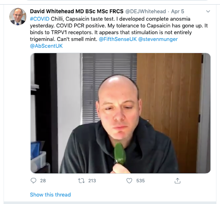 One British surgeon with COVID-19 posted a video to Twitter showing that he had lost the ability to feel the burn of chilies. Others, like Penn State undergraduate Caela Camazine, reported losing their sense of smell and taste completely without any nasal congestion.