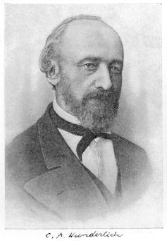 Many trace this number back to an 1871 book on medical thermometry by a German physician named Carl Reinhold August Wunderlich who measured the underarm temperatures of thousands of people. Readers seem to have taken away the monolithic 98.6 number, but Wunderlich in fact wrote that based on his measurement “healthy persons under varying conditions” had temperatures that ranged from 97.16 F to 100.4 F.