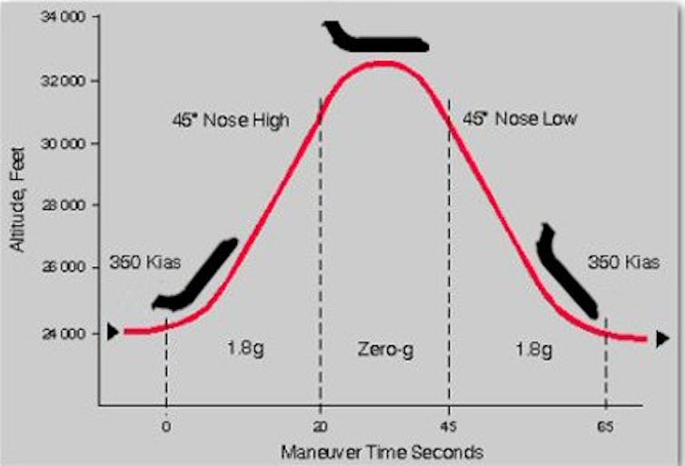 The shape of the vomit-comet flight path is called a parabola. Pilots achieve this by flying upwards at an angle of about 45 degrees and then they level out and dive at about 45 degrees, which creates the acceleration needed to cancel out gravity. The maximum speed for the airplane and how rapidly the airplane can pull up before and after a parabola determine how long this acceleration can last, about 25 seconds.