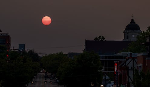 In early September, the jet stream’s path abruptly dipped south, draping it through the Western states. When this happened, the air current picked up the rising plumes of smoke and transported them across the U.S. in a layer of air between 10,000 and 20,000 feet above sea level. As the smoke layer raced eastward at up to 100 mph, it spread over cities along the way – dimming the Sun and creating red sunsets.